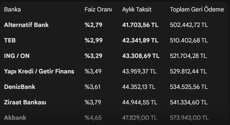 Bankaların sunduğu güncel faiz oranlarına göre aylık taksitler ve toplam geri ödeme tutarları şu şekilde şekilleniyor: