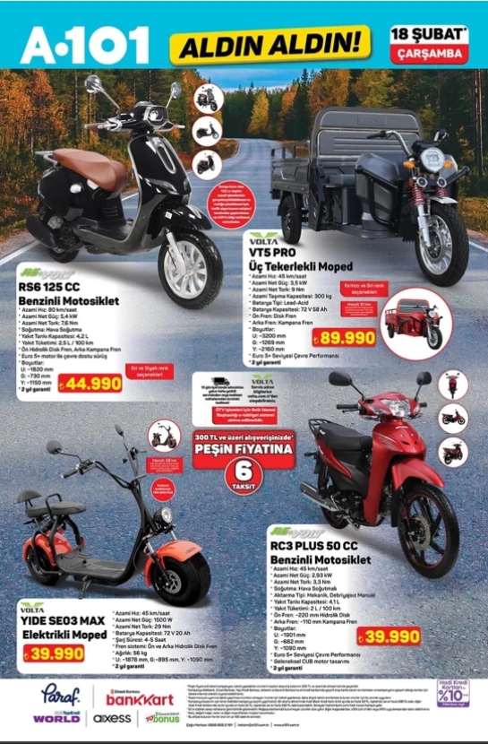 Perakende zinciri A101, 18 Şubat tarihli aktüel kataloğunda ulaşım kategorisine geniş yer ayırdı. Kampanya kapsamında hem benzinli motosikletler hem de elektrikli moped seçenekleri satışa sunulacak. Farklı motor hacmi ve teknik özelliklere sahip modeller, peşin fiyatına taksit imkânıyla tüketicilerin beğenisine sunuluyor.