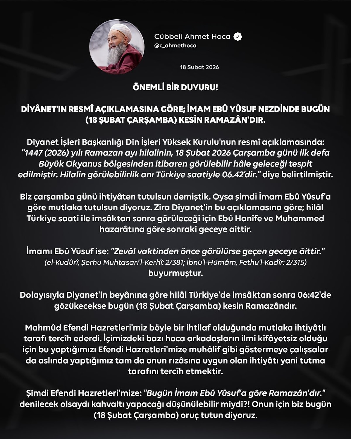 İhtiyat Vurgusu: Daha önce “ihtiyaten” (tedbir amaçlı) oruç tutulması gerektiğini söyleyen Ünlü, son açıklamasında “Artık kesin olarak 18 Şubat Çarşamba günü oruç tutulması gerekiyor” ifadelerini kullanarak takipçilerine seslendi.