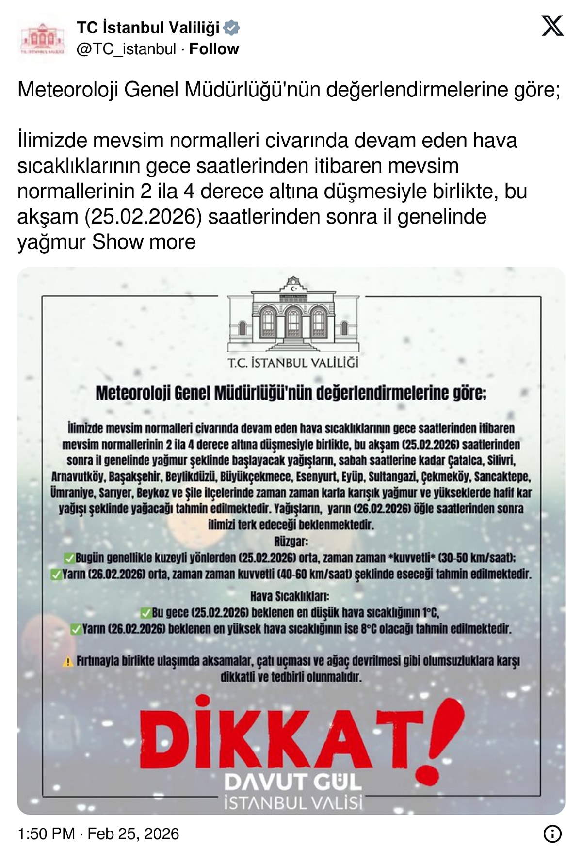 İstanbul Valiliği, özellikle yarın (Perşembe) rüzgarın şiddetini artıracağını vurgulayarak şu konularda tedbirli olunmasını istedi: