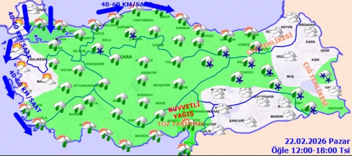 Türkiye, yeni bir soğuk ve yağışlı hava dalgasının etkisi altına girdi. Meteoroloji Genel Müdürlüğü tarafından paylaşılan son verilere göre; Marmara, Ege ve Akdeniz başta olmak üzere yurt genelinde sağanak yağış ve fırtına etkili olacak. Bazı bölgelerde ise kar yağışı ve çığ tehlikesi uyarısı yapıldı. Peki, hangi illerde kar bekleniyor? Fırtına hızı kaç kilometreyi bulacak? İşte 22 Şubat Pazar ve haftalık hava durumu raporunun detayları…