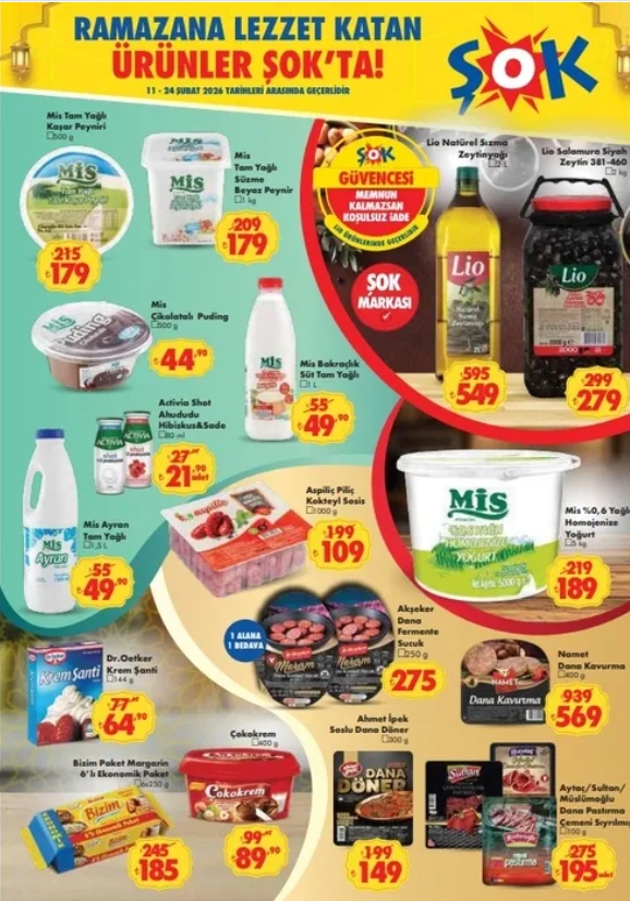 ŞOK Market tarafından duyurulan “Ramazana Lezzet Katan Ürünler” kampanyası 11-24 Şubat 2026 tarihleri arasında geçerli olacak. Ürünlerin stoklarla sınırlı olduğu belirtilirken, fiyatların mağazalara göre değişiklik gösterebileceği ifade edildi.